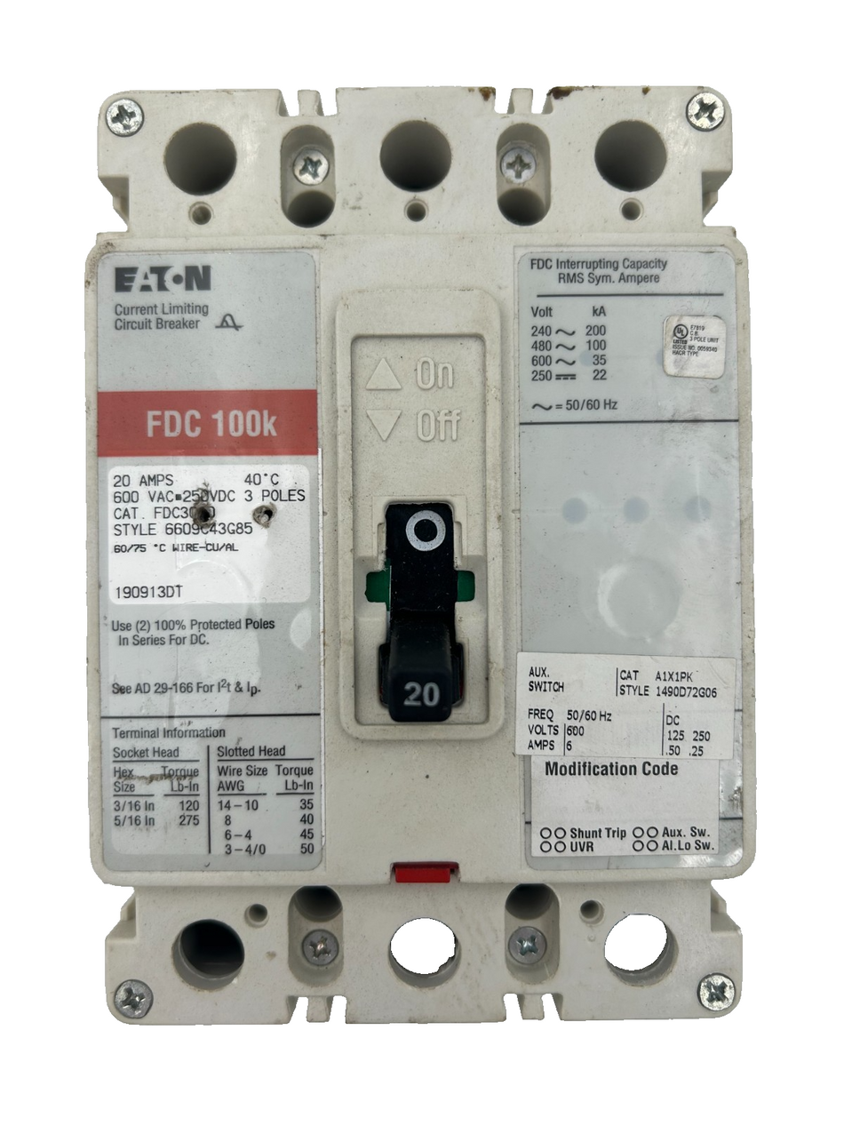 Eaton FDC3020 Circuit Breaker 20A 3Pole 600VAC