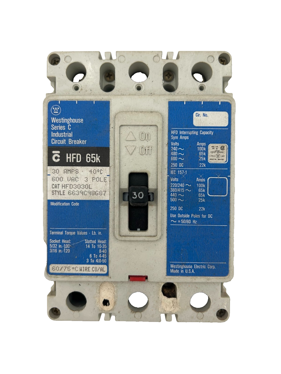 Westinghouse HFD3030L Circuit Breaker 30A 3Pole 600VAC