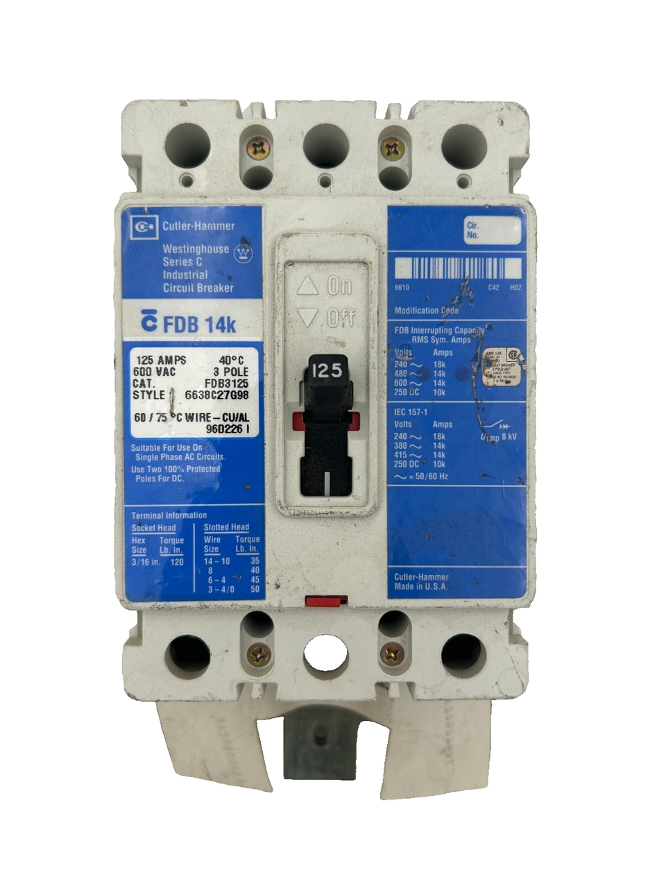CutlerHammer FDB3125 Circuit Breaker 125A 3Pole 600VAC
