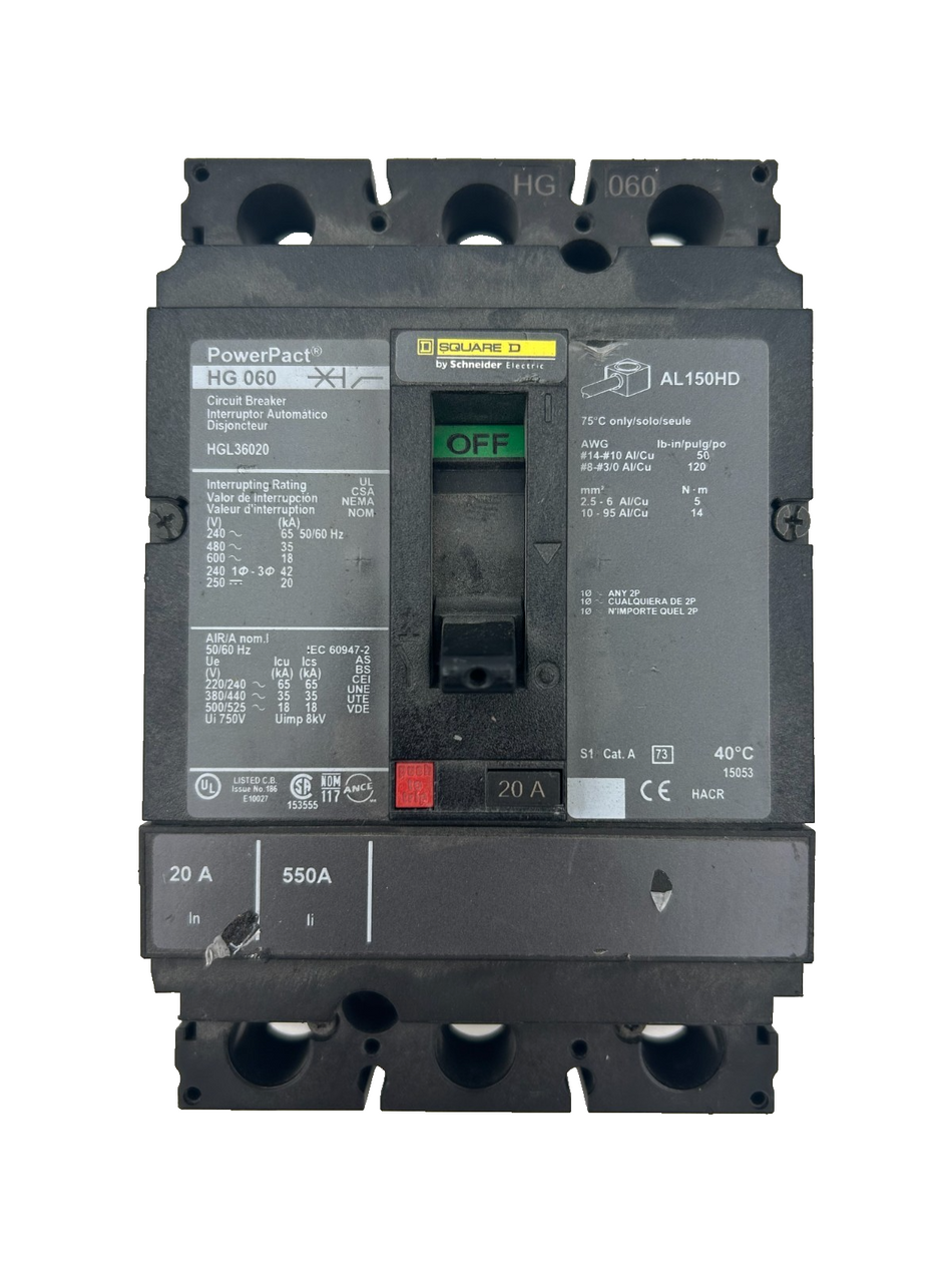 Square D HGL36020 PowerPact Circuit Breaker 20A 3Pole 600V