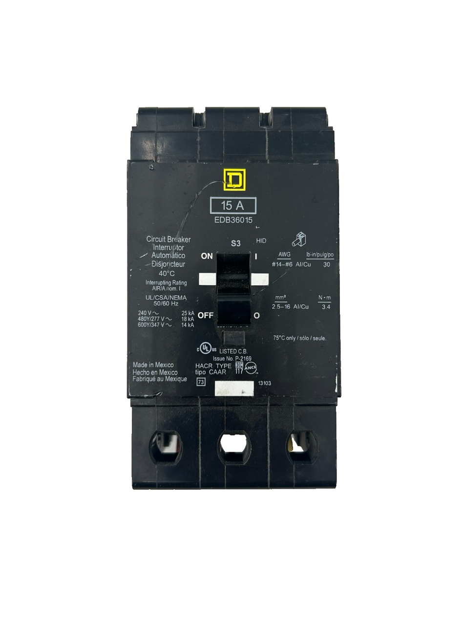 Square D EDB36015 Circuit Breaker 15A 3Pole 600V