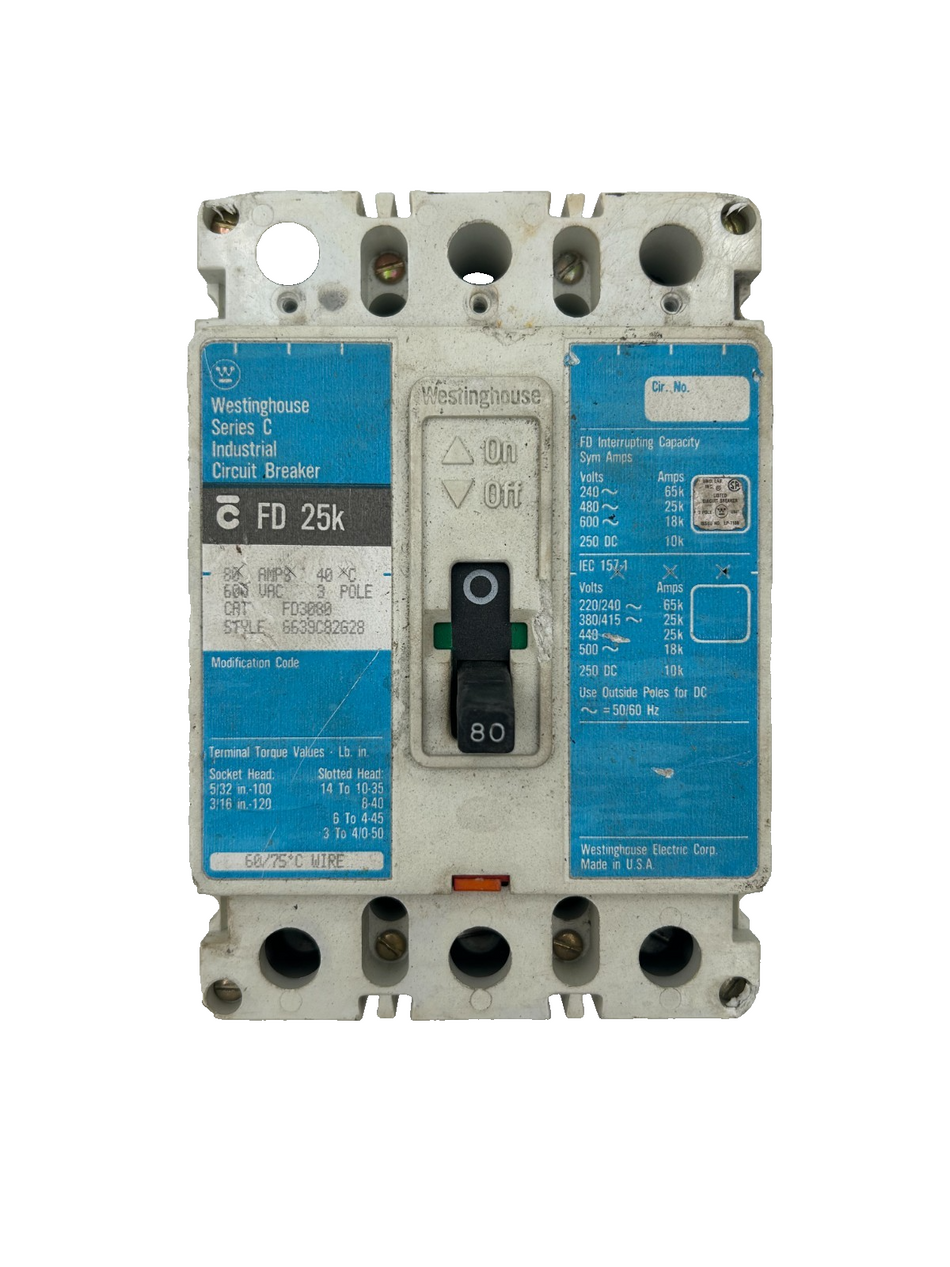 Westinghouse FD3080 Circuit Breaker 80A 3Pole 600VAC